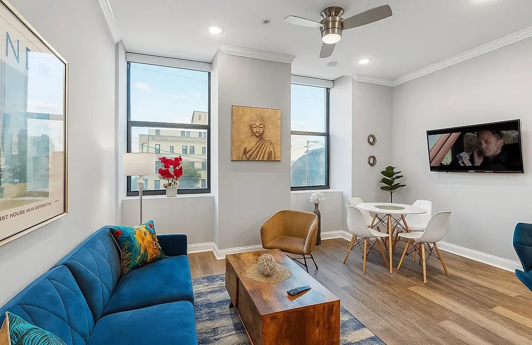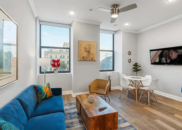 The 70 m² Modern Nolibs 1Br - Pool & Gym Apartment Philadelphia includes a patio and is located around a 25-minute walk from the Liberty Bell. Offering access to a private pool, this 1-bedroom apartment is a short way from the Liberty Lands.